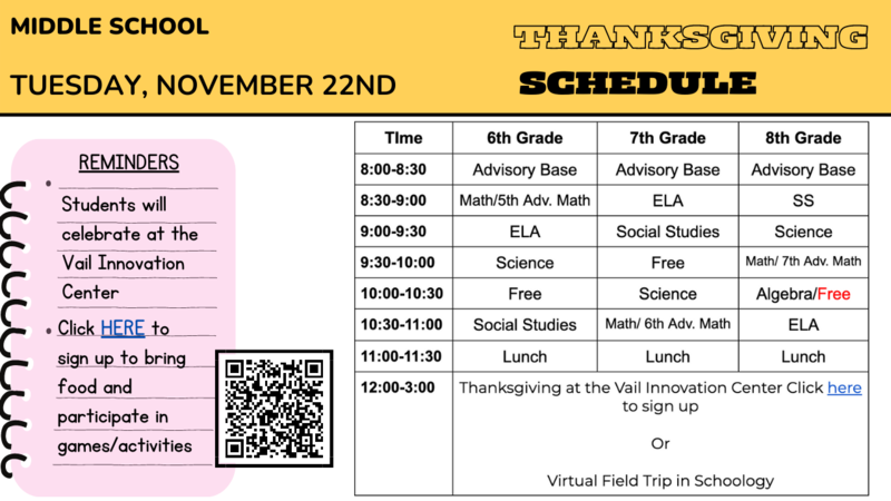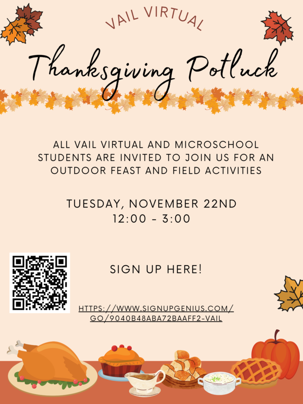 Middle School students: Vail Virtual 6-8 graders will join Vail Blended Learning 6-8th graders in having a Thanksgiving feast, games and activities. Please see the attached flier below. Click here to sign up to bring food as well as participate in games and activities.